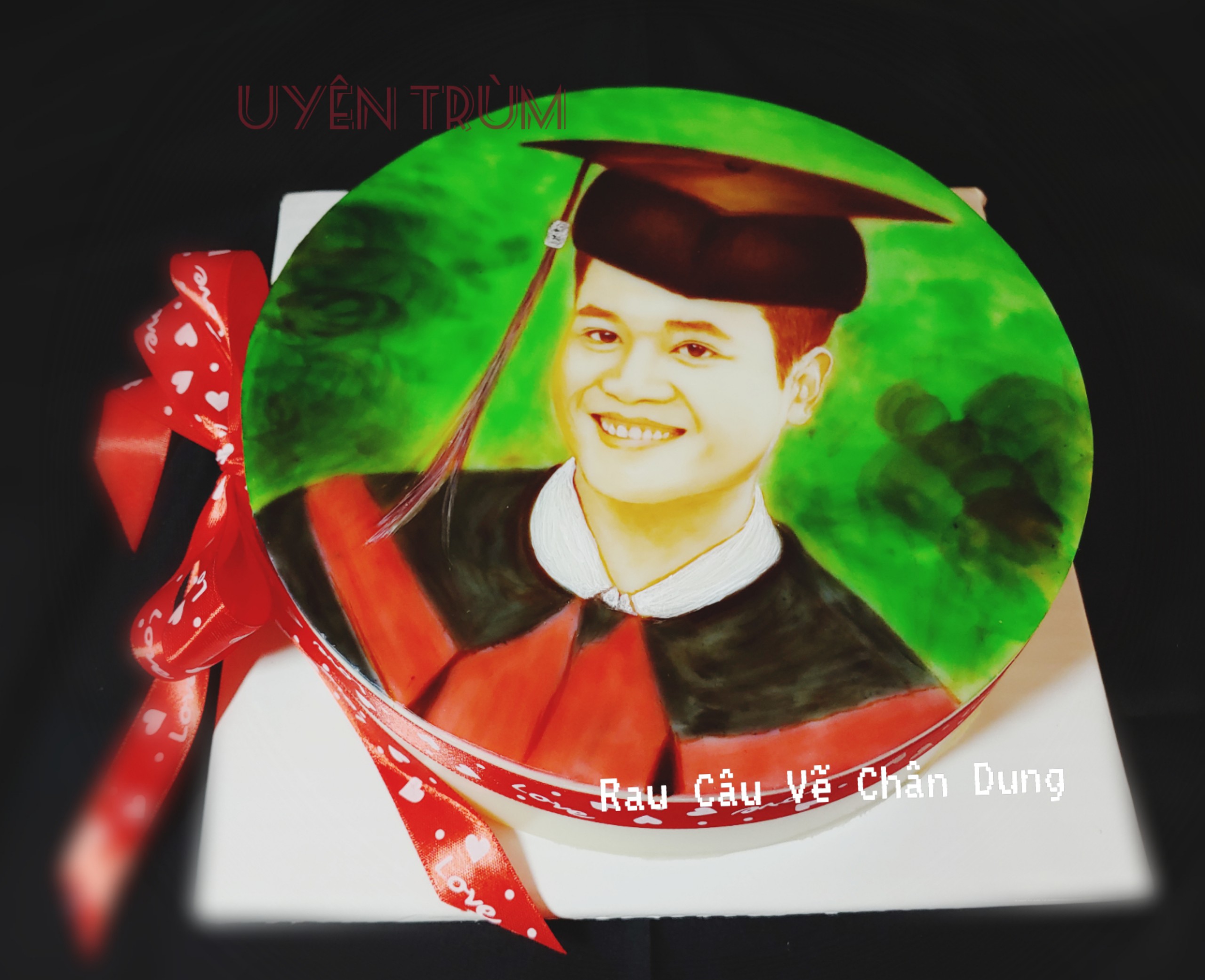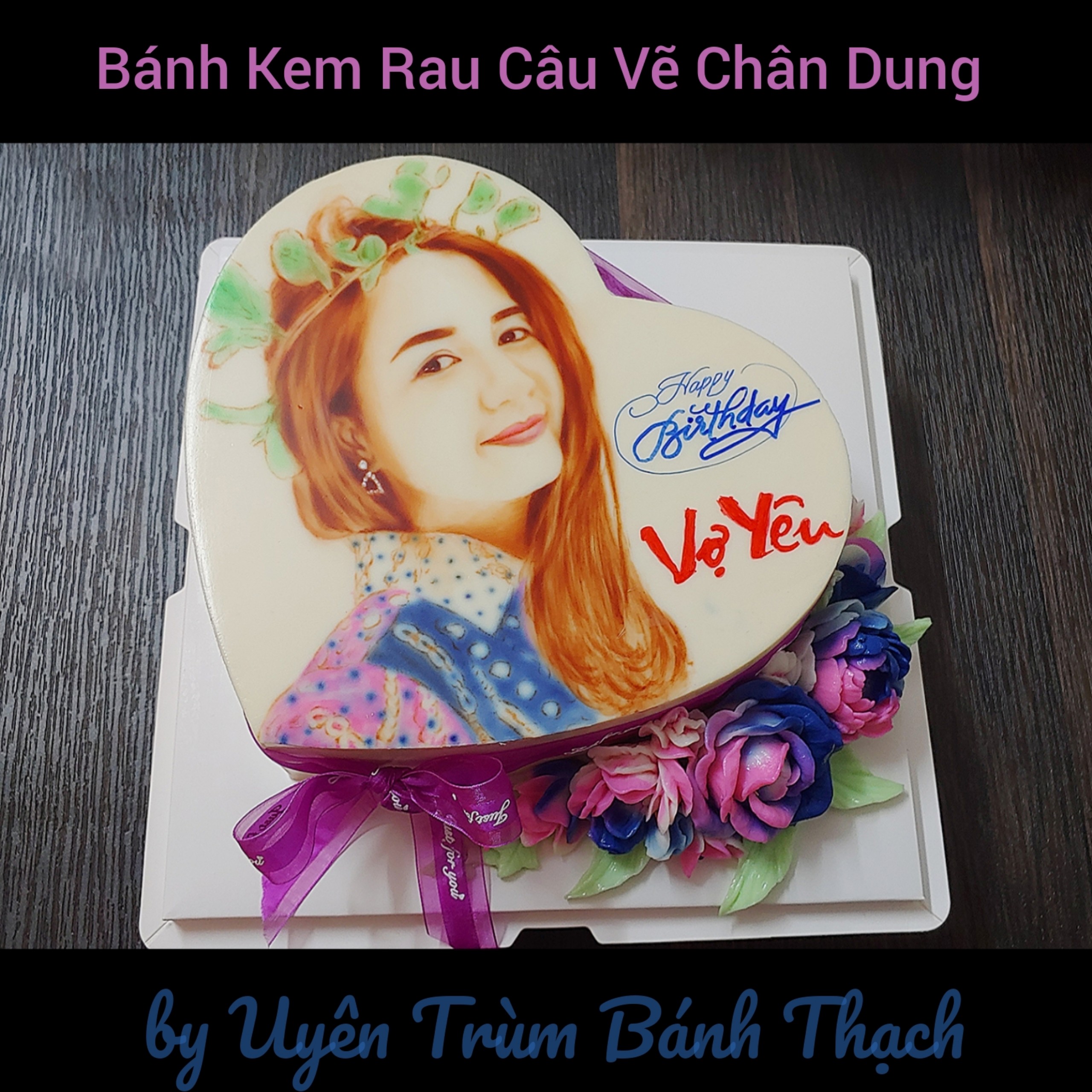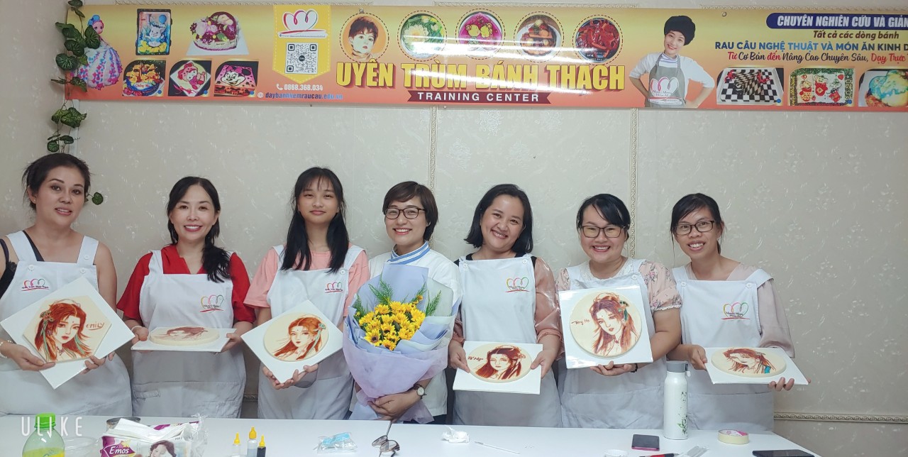 Bén duyên đầu tiên với bánh rau câu không phải từ rau câu vẽ, mà từ rau câu 3D, 4D, nhưng Uyên lại chọn bánh kem rau câu vẽ chân dung bằng cọ để khởi nghiệp cho mình ngay từ những ngày đầu tiên bước vào giảng dạy về bánh rau câu. Lý do rất đơn giản vì bánh kem rau câu vẽ chân dung bằng cọ không cần phải sắm đồ đạc gì nhiều, không cần biết vẽ (link mua dụng cụ tại đây) mà vẫn có thể vẽ được những hình bạn thích, mặt vẽ lại có thể linh hoạt dùng trang trí cho các dòng bánh rau câu, xôi, bánh kem ...đều được. Và quan trọng là chi phí thực hành cho mỗi bánh cũng khá rẻ, chỉ dưới 15K là đã đủ cho cả nguyên liệu và dụng cụ thực hành cho 1 mặt chân dung rồi. Thế nên dù khó khăn đến mấy cũng vẫn có thể khởi nghiệp tốt với dòng bánh này nhé các bạn, vấn đề còn lại chỉ là các bạn có chịu khó học bài và tập luyện hay không mà thôi.